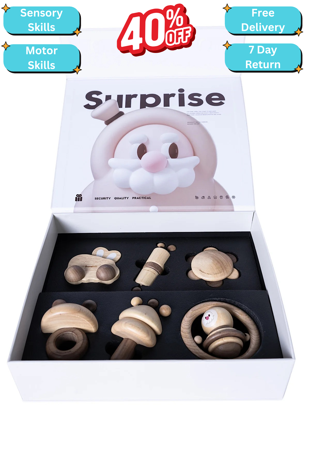 This charming set of 6 wooden rattles is a perfect gift for infants, stimulating their senses and encouraging exploration.